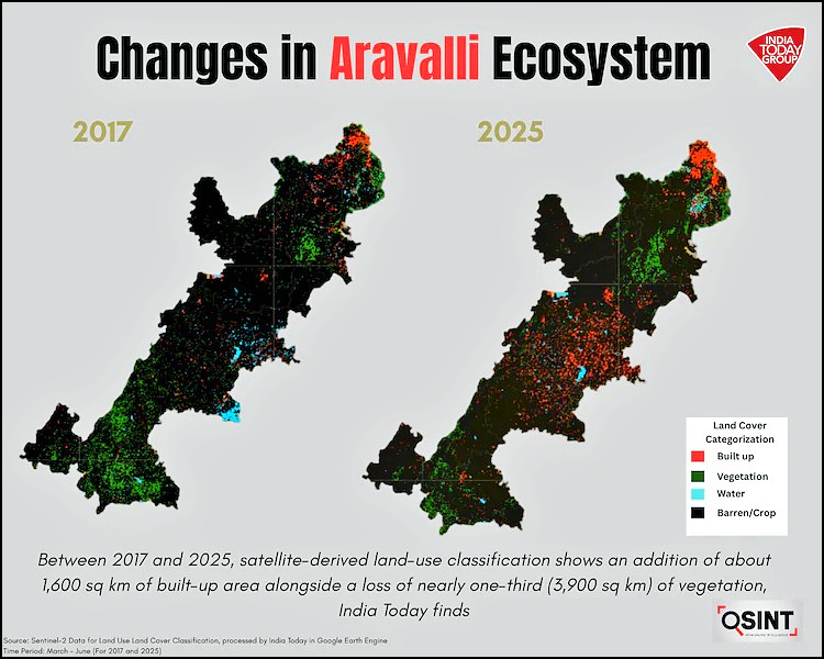 ఇక, తాజా విశ్లేషణ ప్రకారం గత ఎనిమిది సంవత్సరాలలో ఆరావళిలో పచ్చదనం క్రమంగా కోతకు గురైంది. వృక్షసంపద దాదాపు మూడింట ఒక వంతు తగ్గింది. దశాబ్దం కంటే తక్కువ కాలంలోనే దాదాపు 11,392 చదరపు కిలోమీటర్ల నుండి 7,521 చదరపు కిలోమీటర్లకు అటవీ ప్రాంతం తగ్గిపోయింది. మరోవైపు.. రాజస్థాన్ సెంట్రల్ యూనివర్సిటీ (CURaj) పరిశోధకులు 1975, 2019 మధ్య ఉపగ్రహ చిత్రాలు అధ్యయనం చేసి అంచనాలను రూపొందించారు. వారు విశ్లేషించిన డేటా ప్రకారం 44 సంవత్సరాల కాలంలో 5772.7 చదరపు కిలోమీటర్లు లేదా ఆరావళి శ్రేణులు దాదాపు 8 శాతం చదును చేయబడ్డాయని పేర్కొంది.