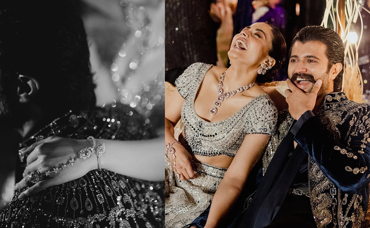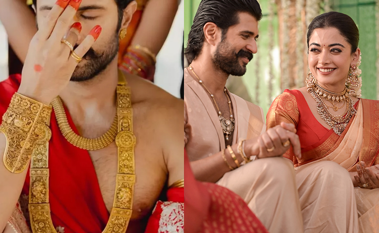 విజయ్ ప్రత్యేకమైన వజ్రాలు పొదిగిన పచ్చ నెక్లెస్ మాత్రం స్పెషల్ ఎట్రాక్షన్. విజయ్ నెక్లెస్లో మధ్యలో భారీ పచ్చ లాకెట్టు అందంగా అమిరిందిన. ఆ లాకెట్టు పైన ఒక పెద్ద డైమండ్ క్యాప్ మరింత వన్నెతెచ్చింది. అలాగే ఎంగేజ్మెంట్ రింగ్గా భావిస్తున్న విజయ్ పదహారు రాళ్ల డైమండ్ రింగ్ చాలా విలక్షణమైంది.ఆ ఉంగరంలో ప్రేమకు చిహ్నంగా బ్రాండ్ క్రిస్క్రాస్ X మోటిఫ్ కూడా ఉంది. ఈ వజ్రపు ఉంగరం ధర సుమారు రూ. 15 లక్షలు ఫిబ్రవరి 26, 2026న, తెలుగు, కొడవ సంప్రదాయల ప్రకారం వివాహ వేడుక జరిగితన తరువాత తమ పెళ్లి ఫోటోలను సోషల్ మీడియాలో పంచుకున్నారు.