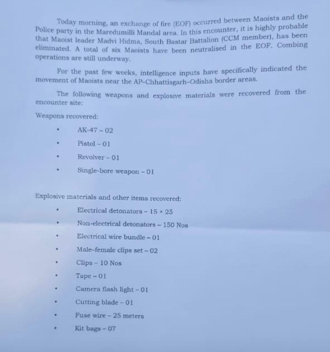 హిడ్మా మృతిపై ఏపీ ఇంటెలిజెన్స్ చీఫ్ మహేష్ చంద్ర లడ్హా మీడియాతో స్పందించారు. ఎన్కౌంటర్ అయిన స్థలం నుంచి భారీగా ఆయుధాలు, పేలుడు పదార్థాలు స్వాధీనం చేసుకున్నట్లు తెలిపారాయన. ‘‘రెండు రోజుల కిందటే మాకు పక్కా సమాచారం వచ్చింది. ఛత్తీస్గఢ్లో తలదాచుకునే అవకాశం లేకపోవడంతో ఏపీకి వచ్చే ప్రయత్నం చేశారు. మావోయిస్టుల కార్యకలాపాలపై నిఘా ఉంచాం’’ అని అన్నారాయన.