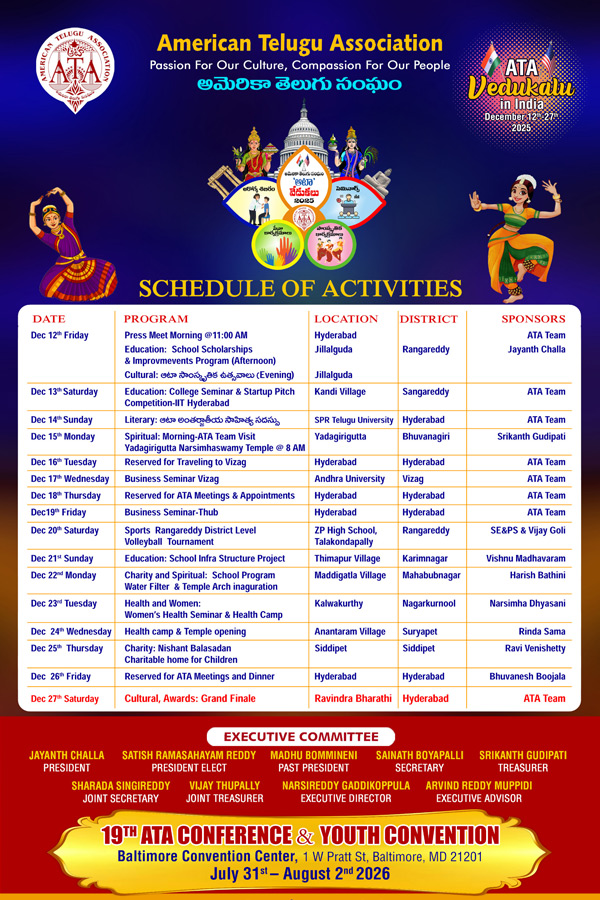 ఆటా అధ్యక్షుడు జయంత్ చల్లసహాయ సహకారాలతో, ఆటా ప్రెసిడెంట్ ఎలెక్ట్ & ఆటా వేడుకల కమిటీ చైర్ సతీష్ రెడ్డి ఆధ్వర్యంలో ఆటా వేడుకలు జరగబోతున్నాయి.
