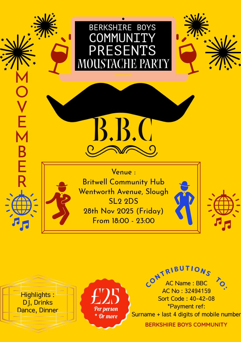 బిబిసి (బెర్క్షైర్ బాయ్స్ కమ్యూనిటీ) ఆధ్వర్యంలో ఇటీవల బ్రిట్వెల్ లైబ్రరీలో మువెంబర్ డేని ఘనంగా నిర్వహించారు. యూకె నలుమూలనుండి యువత పెద్ద ఎత్తున తరలి వచ్చి ప్రోస్టేట్ కాన్సర్ అవేర్నెస్ ప్రోగ్రాంలో పాల్గొన్నారు . ఈ కార్యక్రము ద్వారా మగవాళ్ళ లో తరచుగా వచ్చే ప్రోస్టేట్ కాన్సర్ పైన అవగాహన కల్పించి , దాన్ని ఎలా నిర్ములించుకోవాలో సూచనలు చేసి ,చారిటీ ప్రోగ్రాం నిర్వహించామని నిర్వాహకులు తెలిపారు. ఈ ప్రోగ్రాంతో ప్రోస్టేట్ క్యాన్సర్ అవగాహన వంద మందికి పైగా పురుషులు హాజరైనారు. .