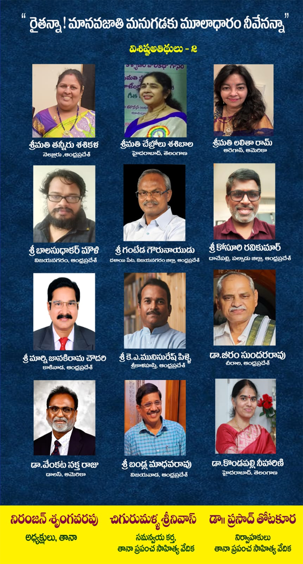 తానా ప్రపంచసాహిత్యవేదిక నిర్వాహకులు డా. ప్రసాద్ తోటకూర మాట్లాడుతూ - వివిధ రకాల పంటల ఉత్పత్తులలో, ఎగుమతులలో భారతదేశం ముందువరుసలోఉన్నా రైతు మాత్రం తరతరాలగా వెనుకబడిపోతూనే ఉన్నాడన్నారు. మహాకవి పోతన, కవిసార్వభౌమ శ్రీనాధుడులాంటి ప్రాచీన కవులు స్వయంగా వ్యసాయం చేసిన కవి కర్షకులని, గుర్రం జాషువా, ఇనగంటి పున్నయ్య చౌదరి, దువ్వూరి రామిరెడ్డి, తుమ్మల సీతారామమూర్తి లాంటి ఆధునిక కవులు రైతులపై వ్రాసిన కవితలను చదివి వారికి ఘన నివాళులర్పించారు. అలాగే రైతు నేపధ్యంలో వచ్చిన ‘పేద రైతు’, ‘కత్తిపట్టిన రైతు’, ‘రైతు కుటుంబం’, ‘రైతు బిడ్డ’, ‘పాడి పంటలు’, ‘రోజులు మారాయి’, ‘తోడి కోడళ్ళు’ లాంటి సినిమాలు, వాటిల్లోని పాటలు, అవి ఆనాటి సమాజంపై చూపిన ప్రభావం ఎంతైనా ఉందని, ఈ రోజుల్లో అలాంటి సినిమాలు కరువయ్యాయి అన్నారు.