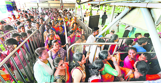 సర్వ దర్శనం క్యూలైన్లు కిటకిట రూ.100, రూ.300 లైన్లలో కనిపించని రద్దీ ఉత్సవ ఏర్పాట్లను పరిశీలించిన కలెక్టర్