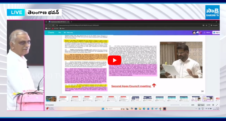 తెలంగాణ భవన్లో కృష్ణా జలాలపై బీఆర్ఎస్ పవర్ పాయింట్ ప్రజెంటేషన్ ఇస్తోంది. ఈ సందర్భంగా మాజీ మంత్రి హరీష్ రావు మాట్లాడుతూ..‘అసెంబ్లీలో అబద్ధాలు చెప్పారు. పాలమూరు వలసలకు కారణమే కాంగ్రెస్ పార్టీ. నల్లగొండ జిల్లాకు మరణశాసనం రాసింది కూడా కాంగ్రెస్ పార్టీనే. విభజనలో సెక్షన్-84 పెట్టి రాష్ట్రానికి అన్యాయం చేశారు. 11వ షెడ్యూల్లో మన ప్రాజెక్ట్లను ఎందుకు పెట్టలేదు?. కాంగ్రెస్ చేసిన ద్రోహాలను కప్పిపుచ్చుకున్నారు. పాలమూరు-రంగారెడ్డి, డిండి ప్రాజెక్ట్లను 11వ షెడ్యూల్లో పెట్టకపోగా విభజన చట్టంలో రక్షణ కల్పించామని సీఎం చెబుతున్నారు. గోదావరి-బనకచర్ల ప్రాజెక్ట్కు లోపాయికారి ఒప్పందం చేసుకున్నారు.
