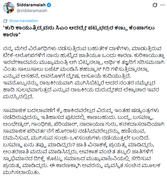 దీంతో, సిద్దరామయ్య పోస్టుపై రాజకీయంగా చర్చ మొదలైంది. కర్ణాటక సీఎం కుర్చీ కోసం సిద్దరామయ్య, డిప్యూటీ సీఎం డీకే శివకుమార్ మధ్య ఘర్షణలు జరుగుతున్న నేపథ్యంలో ఆయన ఇలా వ్యాఖ్యలు చేయడం కన్నడ రాజకీయాల్లో సంచలనంగా మారింది. మరోవైపు.. సిద్దరామయ్య చేసిన వ్యాఖ్యలు ఎవరిని ఉద్దేశించి చేశారని ప్రతిపక్ష నేతలు సైతం ప్రశ్నిస్తున్నారు. ఇదే సమయంలో కులం కార్డులో సిద్దరామయ్య కొత్త రాజకీయాలకు తెరలేపారని వ్యాఖ్యలు చేస్తున్నారు.