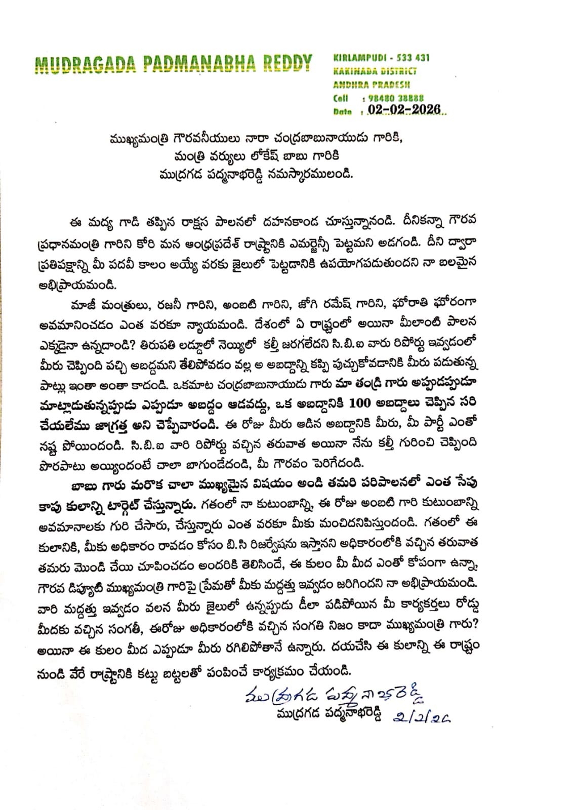 .. మీ పరిపాలనలో ఎంతసేపూ కాపు కులాన్ని టార్గెట్ చేస్తున్నారు. గతంలో నా కుటుంబాన్ని, ఇప్పుడు అంబటి కుటుంబాన్ని అవమానాలకు గురి చేశారు. కాపుల మీద మీరు ఎప్పుడూ రగిలిపోతునే ఉన్నారు. గతంలో కాపులకు రిజర్వేషన్లు ఇస్తానని హమీ ఇచ్చి మొండి చెయ్యి చూపించారు. డిప్యూటీ సీఎం(పవన్ కల్యాణ్ను ఉద్దేశించి..) మీద ప్రేమతో మళ్ళీ కాపులు మీకు మద్దతు ఇచ్చారు. ఇప్పుడు కాపులంతా మీ మీద కోపంతో ఉన్నారు. దయచేసి కాపులను ఈ రాష్ట్రం నుండి వేరే రాష్ట్రానికి కట్టుబట్టలతో పంపించే కార్యక్రమం చేయ్యండి’’ అంటూ చంద్రబాబు, లోకేష్ను ఉద్దేశించి ముద్రగడ పద్మనాభం లేఖలో పేర్కొన్నారు.