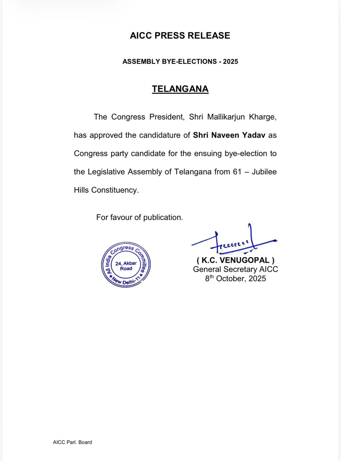 ఢిల్లీ: జూబ్లీహిల్స్ నియోజకవర్గానికి జరగనున్న ఉప ఎన్నికల్లో కాంగ్రెస్ పార్టీ తరఫున నవీన్ యాదవ్ అభ్యర్థిగా పోటీ చేస్తున్నారు. ఈ మేరకు ఏఐసిసి అధికారిక ప్రకటన విడుదల చేసింది. జూబ్లీహిల్స్ తెలంగాణలోని అత్యంత ప్రాముఖ్యమైన నగర ప్రాంత నియోజకవర్గాలలో ఒకటి. నవీన్ వైపే సీఎం రేవంత్రెడ్డి మొగ్గు చూపింనట్లు సమాచారం.