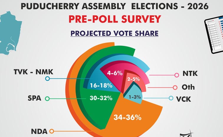 పుదుచ్చేరిలో ఏప్రిల్ 9వ తేదిన జరిగే అసెంబ్లీ ఎన్నికల్లో ఎన్డీయే స్వల్ప మెజారిటీతో అధికారంలోకి వచ్చే అవకాశాలు ఉన్నట్లు పీపుల్స్ పల్స్ రీసర్చ్ సంస్థ నిర్వహించిన ప్రీ పోల్ సర్వేలో వెల్లడయ్యింది. 30 అసెంబ్లీ సీట్లు ఉన్న పుదుచ్చేరిలో ఎన్డీయే 14-17, ఎస్పీయే 9-11, సినీ నటుడు విజయ్ నూతనంగా స్థాపించిన టీవీకే పార్టీ 2-4, ఇతరులు 1-2 సీట్లు గెలుపొందే అవకాశాలు ఉన్నట్లు పీపుల్స్ పల్స్ రీసర్చ్ సంస్థ నిర్వహించిన సర్వేలో వెల్లడయ్యింది.