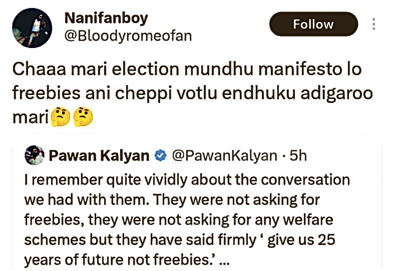 పవన్ కళ్యాణ్ ‘ఎక్స్’లో పెట్టిన పోస్టుపై పలువురు ప్రతిస్పందించారు. ‘యువత ఉచిత, సంక్షేమ పథకాలు కోరుకోకపోతే గత ఎన్నికల ముందు టీడీపీ కూటమి భాగస్వామిగా ఉన్న జనసేన ఎన్నికల మేనిఫెస్టోలో ఎందుకు ఉచిత పథకాలు అమలు చేస్తామని హామీలు ఇచ్చారు? ప్రతి సంవత్సరం రూ.1.2లక్షల కోట్లు ఖర్చయ్యే సంక్షేమ, ఉచిత పథకాలను అమలు చేస్తామని ఎందుకు ప్రచారం చేశారు..? అంటూ పలువురు పవన్కళ్యాణ్ పోస్టుపై స్పందిస్తూ రీ పోస్టులు పెట్టారు. ఎన్నికల సమయంలో పవన్కళ్యాణ్ యువతకు ప్రత్యేకంగా ప్రతి అసెంబ్లీ నియోజకవర్గంలో 100 మంది చొప్పున యువ పారిశ్రామికవేత్తలుగా తీర్చిదిద్దేందుకు రూ.15 లక్షల చొప్పున ప్రభుత్వ పరంగా ఆర్థిక సహాయం అందజేస్తామని ప్రకటించారని, ఆ హామీ ఏమైందని ప్రశ్నిస్తూ కొందరు పోస్టు చేశారు.