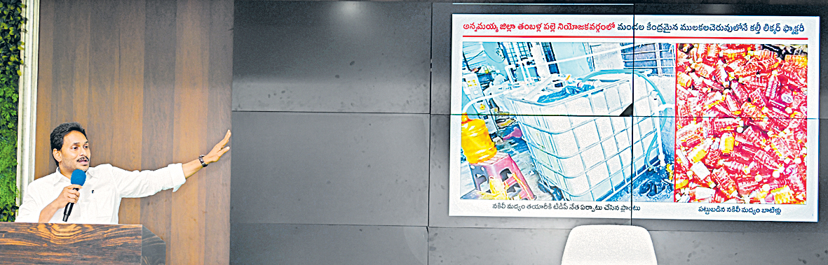 అన్నమయ్య జిల్లా తంబళ్లపల్లె నియోజకవర్గం ములకలచెరువులో బయటపడిన నకిలీ లిక్కర్ ఫ్యాక్టరీలోని యంత్రాలు, మద్యం బాటిళ్ల ఫొటోలు చూపిస్తున్న వైఎస్ జగన్