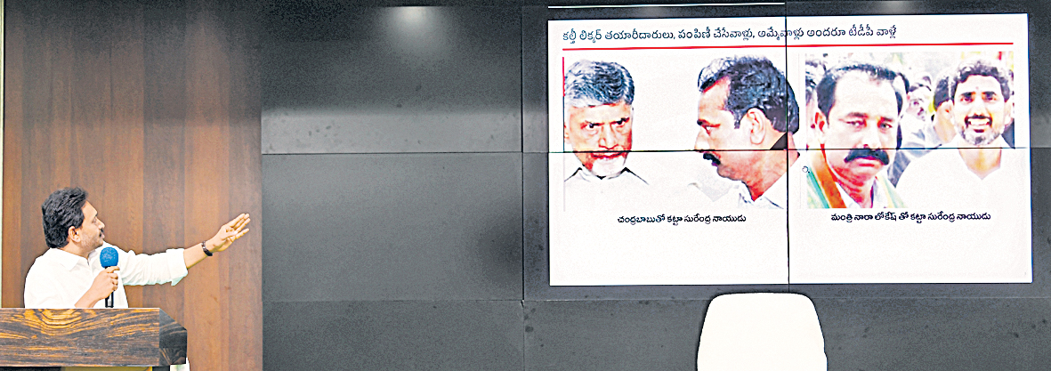 నకిలీ లిక్కర్ తయారీదారులు, విక్రేతలు అందరూ టీడీపీ వాళ్లేనని వివరిస్తూ నిందితుడు కట్టా సురేంద్రనాయుడు.. టీడీపీ అధినేత చంద్రబాబు, లోకేశ్తో ఉన్న ఫొటోలను చూపిస్తున్న వైఎస్ జగన్