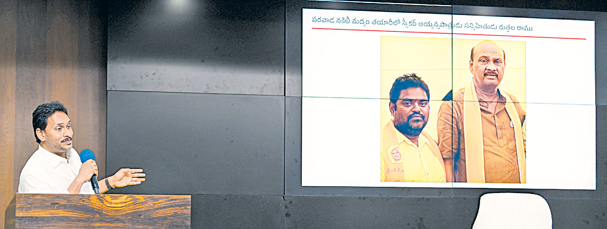 అనకాపల్లి జిల్లా పరవాడలో నకిలీ మద్యం తయారీ నిందితుడు రుత్తల రాము శాసనసభ స్పీకర్ అయ్యన్నపాత్రుడికి సన్నిహితుడని తెలిపే ఫొటో చూపిస్తున్న వైఎస్ జగన్