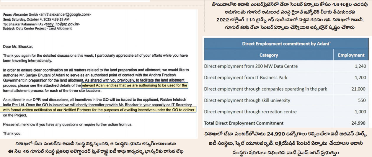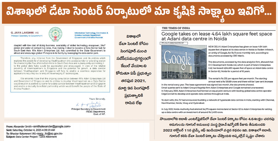 డేటా సెంటర్కు డేటా రావాలంటే సింగపూర్ నుంచి 3,900 కి.మీ. పొడవున సబ్సీ (సముద్ర గర్భం)లో కేబుళ్లు వేయాలని.. అందుకోసం 2021 మార్చి 9న సింగపూర్ ప్రభుత్వానికి లేఖ సైతం రాశామని పేర్కొంటూ ఆ లేఖ ప్రతులను విడుదల చేశారు. నోయిడాలో అదానీ ఎంటర్ప్రైజెస్లో డేటా సెంటర్ ఏర్పాటుకు 4.64 లక్షల చదరపు అడుగుల స్థలాన్ని గూగుల్ అనుబంధ సంస్థ రైడాన్ ఇన్ఫోటెక్ లీజుకు తీసుకుందంటూ 2022 అక్టోబర్ 11న టైమ్స్ ఆఫ్ ఇండియా కథనాన్ని ప్రచురించిందని ఆ క్లిప్పింగ్ను చూపారు. ఈ నేపథ్యంలో డేటా సెంటర్లకు సంబంధించి గూగుల్తో వ్యాపార అనుబంధం ఉన్న అదానీ సంస్థతో విశాఖలో డేటా సెంటర్ ఏర్పాటుకు 2023 మే 3న శంకుస్థాపన చేశామని.. అందుకోసం 190 ఎకరాల భూమిని కూడా కేటాయించామని గుర్తు చేశారు.