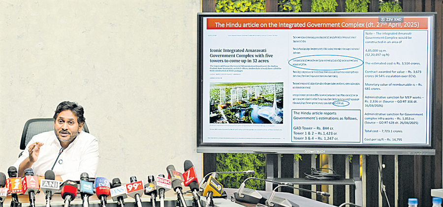 రాజధాని అమరావతి నిర్మాణాలకు అనూహ్యంగా రేట్లు పెంచడంపై ది హిందూ పత్రికలో ప్రచురించిన కథనాన్ని ప్రదర్శిస్తున్న వైఎస్ జగన్