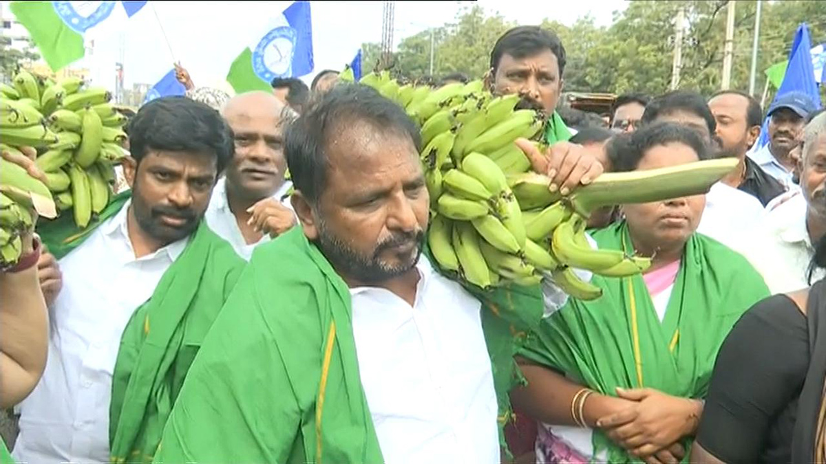 సాక్షి, అనంతపురం: చంద్రబాబు సర్కార్కు వ్యతిరేకంగా అనంతపురంలో అరటి రైతులు కదం తొక్కారు. సోమవారం ఉదయం జేఎన్టీయూ నుంచి కలెక్టరేట్ దాకా అరటి గెలలతో భారీ ర్యాలీ నిర్వహించారు. ఈ ర్యాలీకి వైఎస్సార్సీపీ మద్దతు ప్రకటించగా.. శింగనమల ఇంచార్జి శైలానాథ్ పాల్గొని రైతులకు సంఘీభావం ప్రకటించారు.