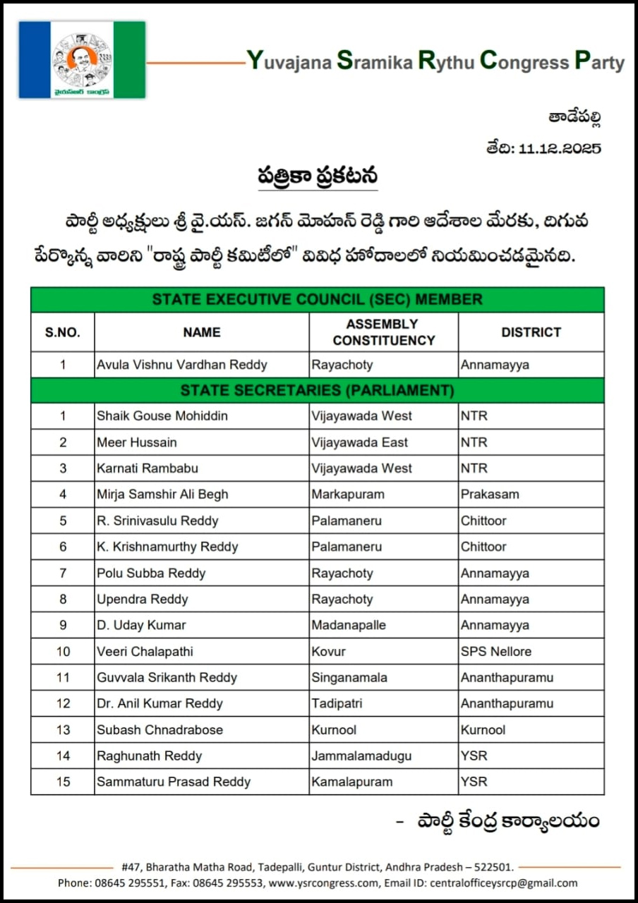 షేక్ గౌస్ మొహిద్దిన్ (విజయవాడ వెస్ట్), మీర్ హుస్సేన్ (విజయవాడ ఈస్ట్), కర్నాటి రాంబాబు (విజయవాడ వెస్ట్), మీర్జా సమీర్ అలీ బేగ్ (మార్కాపురం), ఆర్. శ్రీనివాసులురెడ్డి (పలమనేరు), కె.కృష్ణమూర్తిరెడ్డి (పలమనేరు), పోలు సుబ్బారెడ్డి (రాయచోటి), ఉపేంద్ర రెడ్డి (రాయచోటి), డి. ఉదయ్ కుమార్ (మదనపల్లె), వి.చలపతి (కోవూరు), గువ్వల శ్రీకాంత్ రెడ్డి (సింగనమల), డాక్టర్ అనిల్ కుమార్ రెడ్డి (తాడిపత్రి), సుభాష్ చంద్రబోస్ (కర్నూలు), రఘునాథరెడ్డి (జమ్మలమడుగు), ఎస్. ప్రసాద్ రెడ్డి (కమలాపురం), పార్టీ ఎస్ఈసీ సభ్యునిగా ఆవుల విష్ణువర్ధన్ రెడ్డి (రాయచోటి) నియమితులయ్యారు.