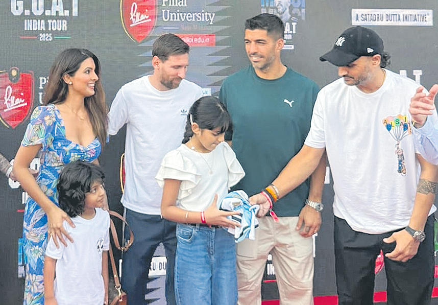 ముంబై: అర్జెంటీనా ఫుట్బాల్ స్టార్ లయోనల్ మెస్సీ తన ‘గోట్ టూర్’లో భాగంగా రెండో రోజు ముంబైని మురిపించాడు. భారత మాస్టర్ సచిన్ టెండూల్కర్తో కలిసి వాంఖెడేలో సందడి చేశాడు. మామూలుగా అయితే ఈ మైదానంలో టెండూల్కర్ ఉంటే ‘సచిన్... సచిన్...’ అనే గోలే వినిపించేది. కానీ ఆదివారం స్వరం మారింది. యువ తరం, నవతరం అంతా కలిసి తమ ఆరాధ్య క్రికెటర్తో పాటు అభిమాన ఫుట్బాలర్ పేరునూ మార్మోగించారు.