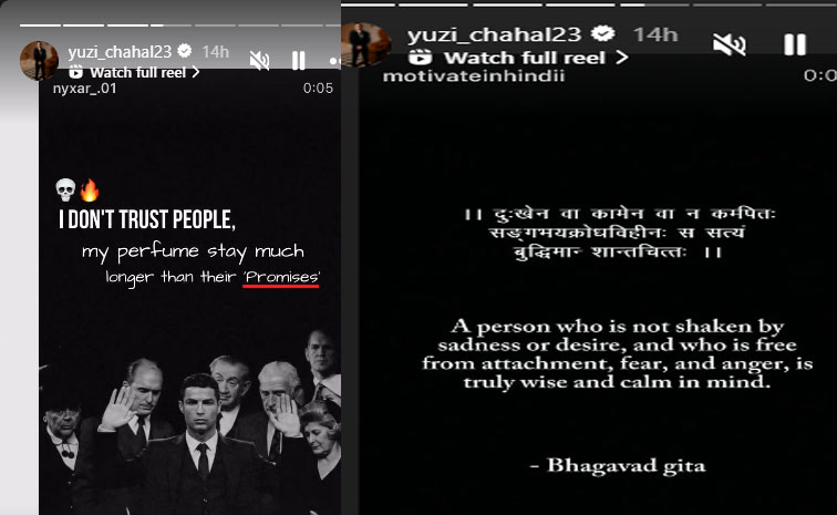 మరో స్టోరీలో ‘‘బాధ, ఆశల వలయంలో చిక్కుకుపోకుండా.. బంధాల్లో మునిగిపోకుండా.. కోపం, భయాన్ని వదిలేసి ముందుకు సాగేవాడే తెలివైన మనిషి’’ అన్న భవద్గీత పంక్తులను కూడా చహల్ షేర్ చేయడం విశేషం.