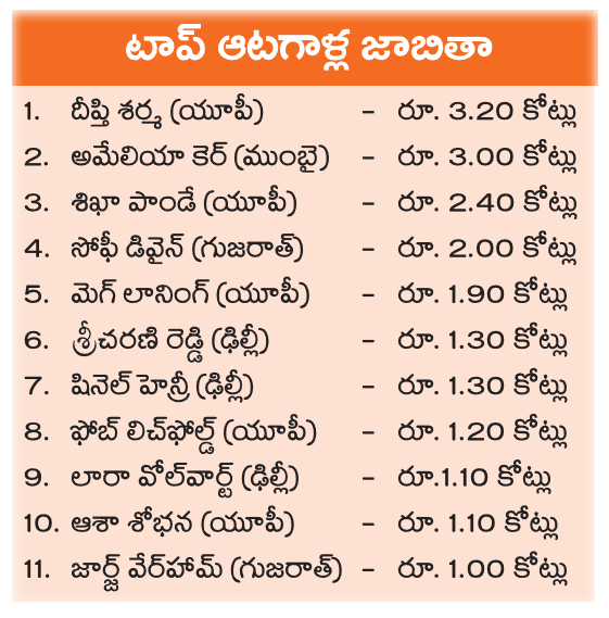 భారత ఆల్రౌండర్ దీప్తి శర్మకు అత్యధికంగా రూ.3.20 కోట్లు దక్కాయి. విదేశీ ఆటగాళ్లలో న్యూజిలాండ్ స్టార్ అమేలియా కెర్కు రూ. 3 కోట్లు లభించగా... 11 మంది ప్లేయర్లకు కనీసం రూ.1 కోటి లేదా అంతకంటే ఎక్కువ మొత్తాలు దక్కాయి.