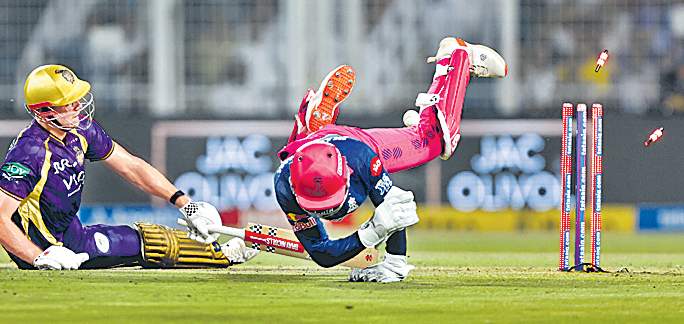 స్వల్ప లక్ష్యఛేదనలోనూ కోల్కతా తడబడింది. ఓపెనర్ సీఫెర్ట్ (0) ఇన్నింగ్స్ తొలి బంతికే క్లీన్ బౌల్డ్ కాగా... కెపె్టన్ అజింక్య రహానే (0) కూడా డకౌట్గా వెనుదిరిగాడు. అంగ్క్రిష్ రఘువంశీ (10) విఫలం కాగా... జురేల్ చేసిన మెరుపు స్టంపౌట్కు గ్రీన్ (13 బంతుల్లో 27; 4 ఫోర్లు, 1 సిక్స్) పెవిలియన్ బాటపట్టాడు.