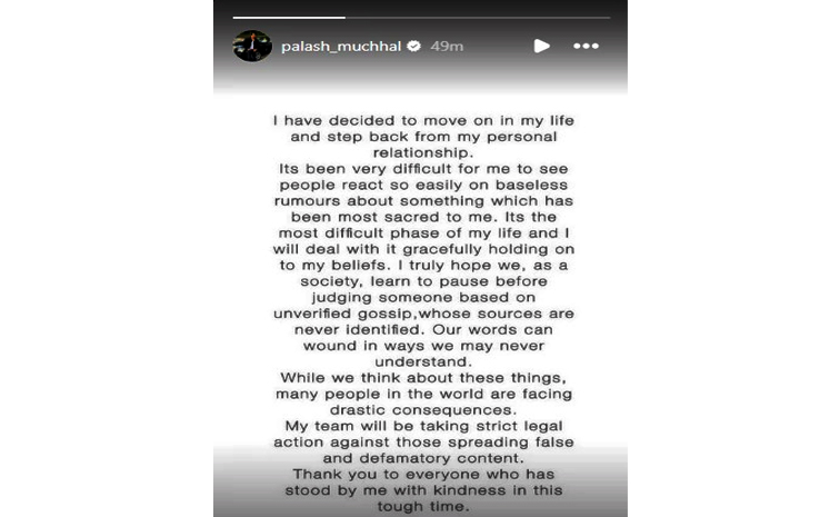 ఇక స్మృతి మంధానాతో తన బంధం ముగిసిందని పలాష్ ముచ్ఛల్ సైతం ధ్రువీకరించాడు. తాము విడిపోవడానికి సంబంధించిన నిరాధారమైన వార్తలను ప్రచారం చేస్తున్న వారిపై చట్టపరమైన చర్యలు తీసుకోబోతున్నట్లు ముచ్ఛల్ తెలిపాడు.