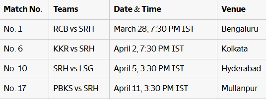 ఈ విడతలో అన్ని జట్లలాగే సన్రైజర్స్ హైదరాబాద్ కూడా నాలుగు మ్యాచ్లు ఆడనుంది. టోర్నీ ఓపెనర్లోనే ఆరెంజ్ ఆర్మీ ఆర్సీబీతో తలపడనుంది. సన్రైజర్స్ రెండో మ్యాచ్ ఏప్రిల్ 2న కోల్కతా వేదికగా కేకేఆర్తో జరుగనుంది. మూడో మ్యాచ్ ఏప్రిల్ 5న హైదరాబాద్ వేదికగా లక్నో సూపర్ జెయింట్స్తో.. నాలుగో మ్యాచ్ ఏప్రిల్ 11న ముల్లాన్పూర్ వేదికగా పంజాబ్ కింగ్స్తో జరుగనుంది.