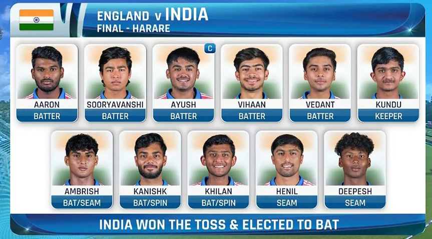 ఐసీసీ అండర్-19 వరల్డ్కప్-2026 టోర్నమెంట్లో భారత్- ఇంగ్లండ్ మధ్య ఫైనల్ మ్యాచ్కు తెరలేచింది. హరారే వేదికగా శుక్రవారం టాస్ గెలిచిన భారత్ తొలుత బ్యాటింగ్ ఎంచుకుంది.