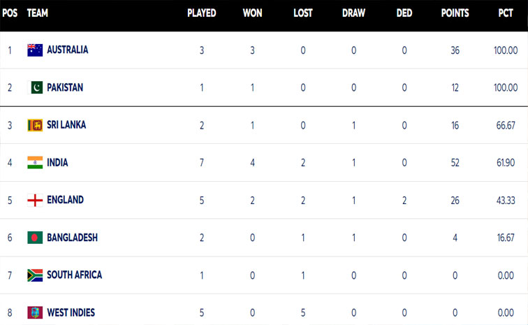 తాజాగా స్వదేశంలో వెస్టిండీస్తో రెండు టెస్టులు ఆడిన టీమిండియా.. 2-0తో విండీస్ను వైట్వాష్ చేసింది. తద్వారా ఇప్పటి వరకు నాలుగు విజయాలు, రెండు ఓటములు, ఒక డ్రా ద్వారా 52 పాయింట్లతో నాలుగో స్థానంలో ఉంది. ఇక టీమిండియాపై రెండు టెస్టులు గెలిచిన ఇంగ్లండ్.. ఒకటి డ్రా చేసుకోవడం ద్వారా మొత్తంగా 26 పాయింట్లతో టాప్-5లో నిలిచింది.