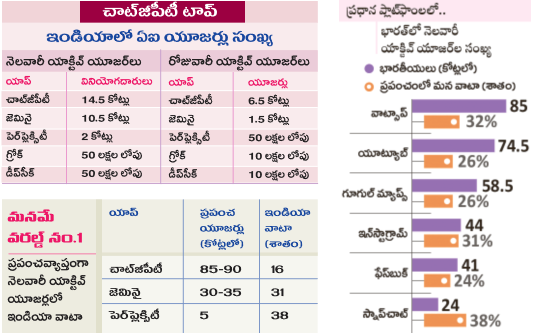 2025 నవంబరు నాటికి ప్రపంచవ్యాప్తంగా ఉన్న నెలవారీ యాక్టివ్ యూజర్లలో.. జెమినైకి 31 శాతం, పెర్ప్లెక్సిటీలను 38 శాతం మంది భారతీయులే కావడం గమనార్హం. ఇక వాట్సాప్, ఇన్స్టాగ్రామ్ వంటి వాటి వినియోగంలోనూ భారత్ దూసుకుపోతోంది. ప్రపంచంలోని మొత్తం వాట్సాప్ వినియోగదారుల్లో మనవాళ్లు 32 శాతం కాగా, ఇన్స్టాగ్రామ్ యూజర్లలో భారతీయులు 31 శాతం కావడం విశేషం.-సాక్షి స్పెషల్ డెస్క్