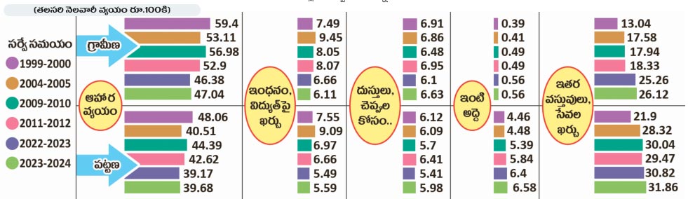 పాతికేళ్ల నాటికీ, నేటికీ గ్రామీణ, పట్టణ భారతీయ కుటుంబాల వ్యయంలో గణనీయమైన మార్పులు వచ్చాయి. ఆహారంపై ఖర్చు తగ్గి.. అనేక ఇతర ఖర్చులు పెరిగాయి. ప్రజలు మెరుగైన జీవనశైలులను కోరుకోవటమే ఇందుకు కారణం. కేంద్ర గణాంక శాఖ గృహ వినియోగ వ్యయ సర్వేలు, నేషనల్ శాంపిల్ సర్వేలు ఇదే విషయాన్ని స్పష్టం చేస్తున్నాయి.