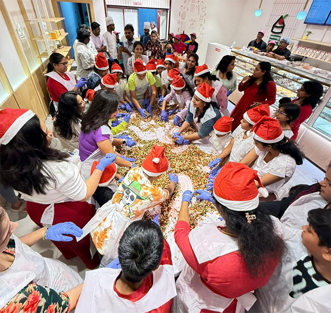 హైదరాబాద్: త్వరలో రాబోతున్న ప్రీ క్రిస్మస్, క్రిస్మస్, కొత్త సంవత్సరాలకు ఇప్పటినుంచే రంగం సిద్ధమవుతోంది. నగరంలోని తెల్లాపూర్లో గల బేకర్స్ ఫన్లో కేక్ మిక్సింగ్ సందడి మొదలైంది. చుట్టుపక్కల ప్రాంతాల నుంచి దాదాపు 30 మంది వరకు పిల్లలు, పెద్దలు అందరూ ఈ కార్యక్రమానికి వచ్చి ఎంతో ఉత్సాహంగా కేక్ మిక్సింగ్లో పాల్గొన్నారు. ఒకప్పుడు పాశ్చాత్య దేశాలకే పరిమితమైన ఈ కేక్ మిక్సింగ్ ఈవెంట్.. ఇటీవలి కాలంలో మన నగరంలోనూ పెద్దపెద్ద హోటళ్లలో నిర్వహిస్తున్నారు. తెల్లాపూర్లోని బేకర్స్ ఫన్ యాజమాన్యం ఈసారి వినూత్నంగా కస్టమర్లతోనే ఈ కేక్ మిక్సింగ్ చేయించారు. జీడిపప్పులు, బాదం పప్పులు, కిస్మిస్లు, డ్రైడ్ కివీ.. ఇంకా అనేక రకాల డ్రైఫ్రూట్స్ అన్నింటినీ తీసుకుని, వాటిని బేకర్స్ ఫన్ వారి ప్రత్యేకమైన సిరప్తో బాగా కలిపారు. దానికితోడు పలు రకాల రంగులతో ఉండే చెర్రీస్ తీసుకుని.. వాటితో బేకర్స్ ఫన్ లోగోను కూడా రూపొందించారు. ఈ సిరప్లో వీటన్నింటినీ దాదాపు నెల రోజుల పాటు నానబెడతారు. తర్వాత తయారుచేసే రిచ్ ప్లమ్ కేక్లో వీటిని కలిపి బేక్ చేస్తారు. అసలు తాము ఈ కొత్త సంవత్సర, క్రిస్మస్ కేకులు ఎలా తయారుచేస్తామన్న విధానాన్ని కస్టమర్లకు కూడా తెలియజేయడం, వారిని కూడా ఈ యాక్టివిటీలో భాగస్వాములను చేయడం కోసమే కేక్ మిక్సింగ్ కార్యక్రమాన్ని ఏర్పాటుచేసినట్లు కంపెనీ డైరెక్టర్ శ్రీమతి హారిక తెలిపారు. ఈ సందర్భంగా వచ్చిన కస్టమర్లందరితో కొన్ని సరదా కార్యక్రమాలు నిర్వహించి, అందరికీ బహుమతులు కూడా పంచారు.