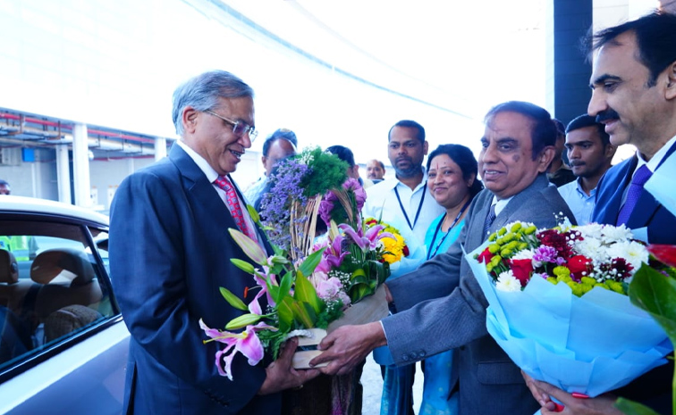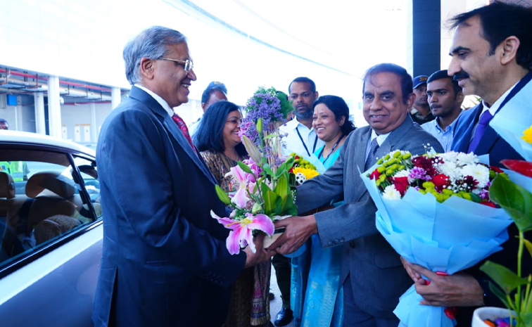 హైదరాబాద్ విమానాశ్రయంలో ప్రధాన ఎన్నికల కమిషనర్ జ్ఞానేశ్ కుమార్కు స్వాగతం పలుకుతున్న తెలంగాణ రాష్ట్ర ప్రధాన ఎన్నికల అధికారి సి. సుదర్శన్ రెడ్డి.