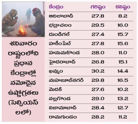 సాక్షి, హైదరాబాద్: వాతావరణంలో మార్పులు వేగంగా నమోదవుతున్నాయి. చలి కాలం చివరి దశకు చేరుతుండడంతో ఉష్ణోగ్రతల్లో హెచ్చుతగ్గులు కనిపిస్తున్నాయి. ప్రస్తుతం రాష్ట్రంలో పగటి పూట ఉష్ణోగ్రతలు సాధారణ స్థితిలో నమోదవుతుండగా...రాత్రి పూట ఉష్ణోగ్రతలు మాత్రం సాధారణం కంటే తక్కువగా నమోదవుతున్నాయి. బంగాళాఖాతంలో మారుతున్న వాతావరణ పరిస్థితులు, వాయుగుండాల ప్రభావం, రాష్ట్రానికి తూర్పు, ఈశాన్య దిశల నుంచి వీస్తున్న గాలులతో చలి తీవ్రత పెరుగుతోంది.
