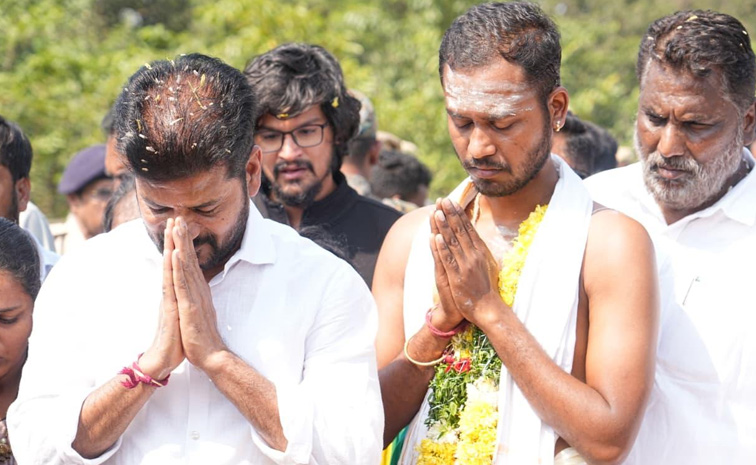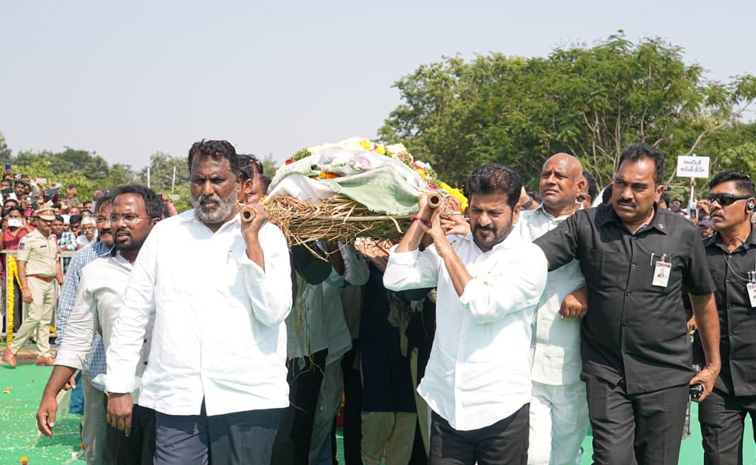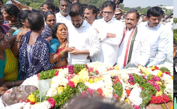 సాక్షి, హైదరాబాద్: ప్రముఖ కవి, రచయిత అందెశ్రీ స్మృతివనం ఏర్పాటు చేస్తామని సీఎం రేవంత్రెడ్డి అన్నారు. ఘట్కేసర్ ఎన్ఎఫ్సీ నగర్లో పోలీస్ లాంఛనాలతో అందెశ్రీ అంత్యక్రియలు జరిగాయి. అందెశ్రీ అంత్యక్రియలకు సీఎం రేవంత్ హాజరయ్యారు. ఆయన అందెశ్రీ పాడెను మోశారు. అంత్యక్రియలు అనంతరం రేవంత్రెడ్డి మీడియాతో మాట్లాడుతూ.. అందెశ్రీ కుటుంబంలో ఒకరికి ఉద్యోగం ఇస్తామన్నారు.