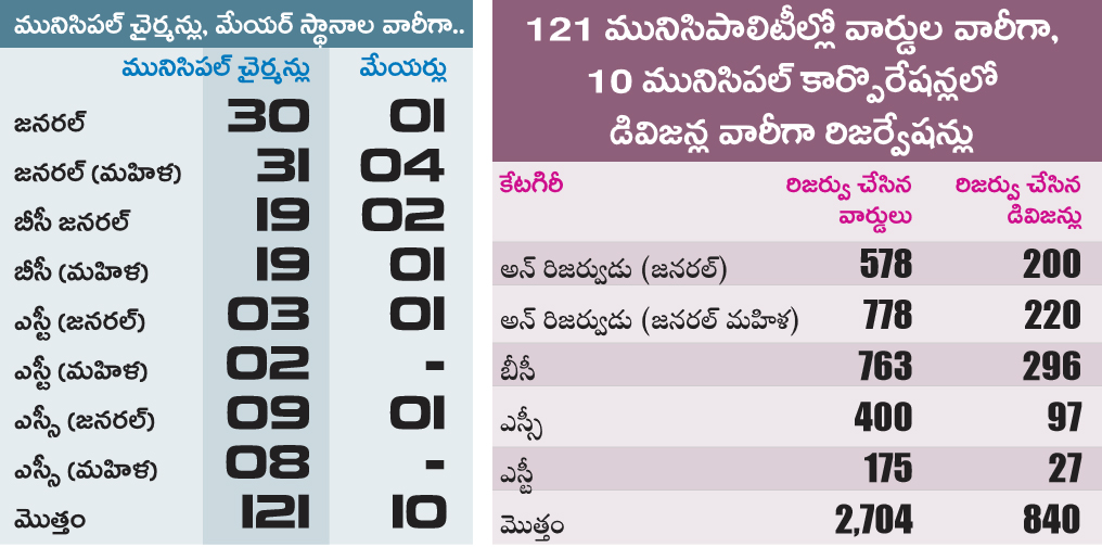 121 మునిసిపల్ చైర్మన్, 10 మేయర్ పదవులకు రిజర్వేషన్లు ఖరారు