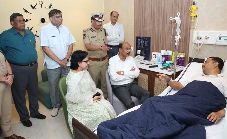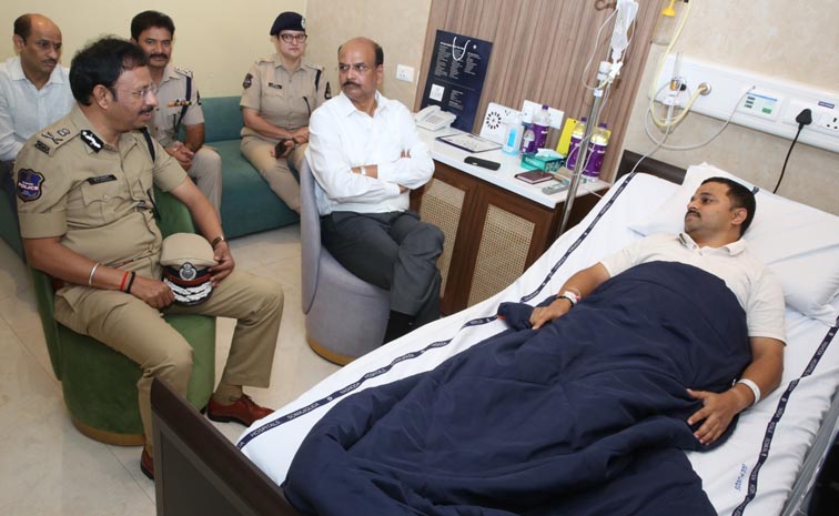 సాక్షి, హైదరాబాద్: నగరం నడిబొడ్డున నిన్న(శనివారం అక్టోబర్ 25) తుపాకీ కాల్పులు కలకలం సృష్టించిన సంగతి తెలిసిందే. చాదర్ఘాట్లోని విక్టోరియా ప్లే గ్రౌండ్ జరిగిన ఈ ఘటనలో గాయపడి చికిత్స పొందుతున్న సౌత్ ఈస్ట్ జోన్ డీసీపీ చైతన్య కుమార్, ఆయన గన్మెన్ వీఎస్ఎన్ మూర్తిలను డీజీపీ శివధర్ రెడ్డి, సీపీ సజ్జనార్ ఆదివారం మధ్యాహ్నం పరామర్శించారు. సోమాజిగూడలోని యశోద ఆసుపత్రిలో వారిని పరామర్శించి.. ఆరోగ్య పరిస్థితిని అడిగి తెలుసుకున్నారు.
