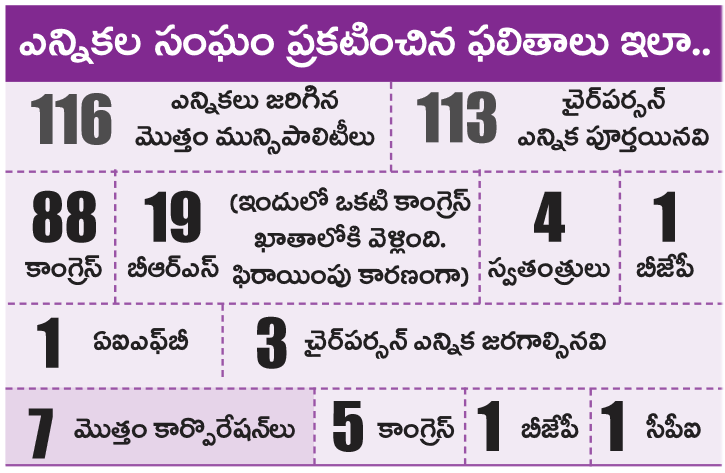 ఇక కాగజ్నగర్లో బీజేపీ సభ్యులు కాంగ్రెస్కు మద్దతునివ్వడంతో అక్కడ చైర్పర్సన్ స్థానాన్ని కైవసం చేసుకుంటే.. వైస్చైర్మన్ స్థానాన్ని బీజేపీ సాధించింది. కాగా ఇబ్రహీంపట్నం ము న్సిపాలిటీలో ఎన్నిక ప్రక్రియ సగం వరకు అయిన తరువాత హైకోర్టు నుంచి స్టే ఉత్తర్వులు రావడంతో.. ఎన్నిక ప్రక్రియను అధికారులు నిలిపివేశారు. ఇది కాకుండా క్యాతనపల్లి, ఖానాపూర్ మున్సిపాలిటీల్లో ఎన్నికలు వా యిదా పడ్డాయి. ఈరోజు కూడా బద్ద శత్రువుల్లా వ్యవహరించే పార్టీలు ఒకరికొకరు సహకరించుకోవడం విశేషం.
