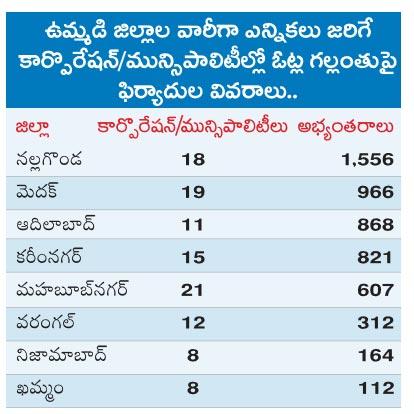 ⇒ నిజామాబాద్ నగరపాలక సంస్థలో 1, 2, 3, 28వ డివిజన్లలో 3,200 ఓట్లు గల్లంతయ్యాయి. ఆ డివిజన్లలోకి వేరే డివిజన్ల నుంచి మరో 2,500 ఓట్లు వచ్చి చేరాయి. వీటిపై అధికారులకు ఫిర్యాదు చేశారు. 4, 43వ డివిజన్ల నుంచి మరో వెయ్యికి పైగా ఓట్లు ఇతర డివిజన్లలోకి వెళ్లిపోయాయని ఫిర్యాదు చేశారు. బోధన్లో ఓటర్ల పేర్లు గల్లంతు అయ్యాయని, భీమ్గల్ మున్సిపాలిటీలో 3 వేల ఓట్లు ఒక వార్డు నుంచి మరో వార్డుకు వెళ్లిపోయాయని ఫిర్యాదు చేశారు.