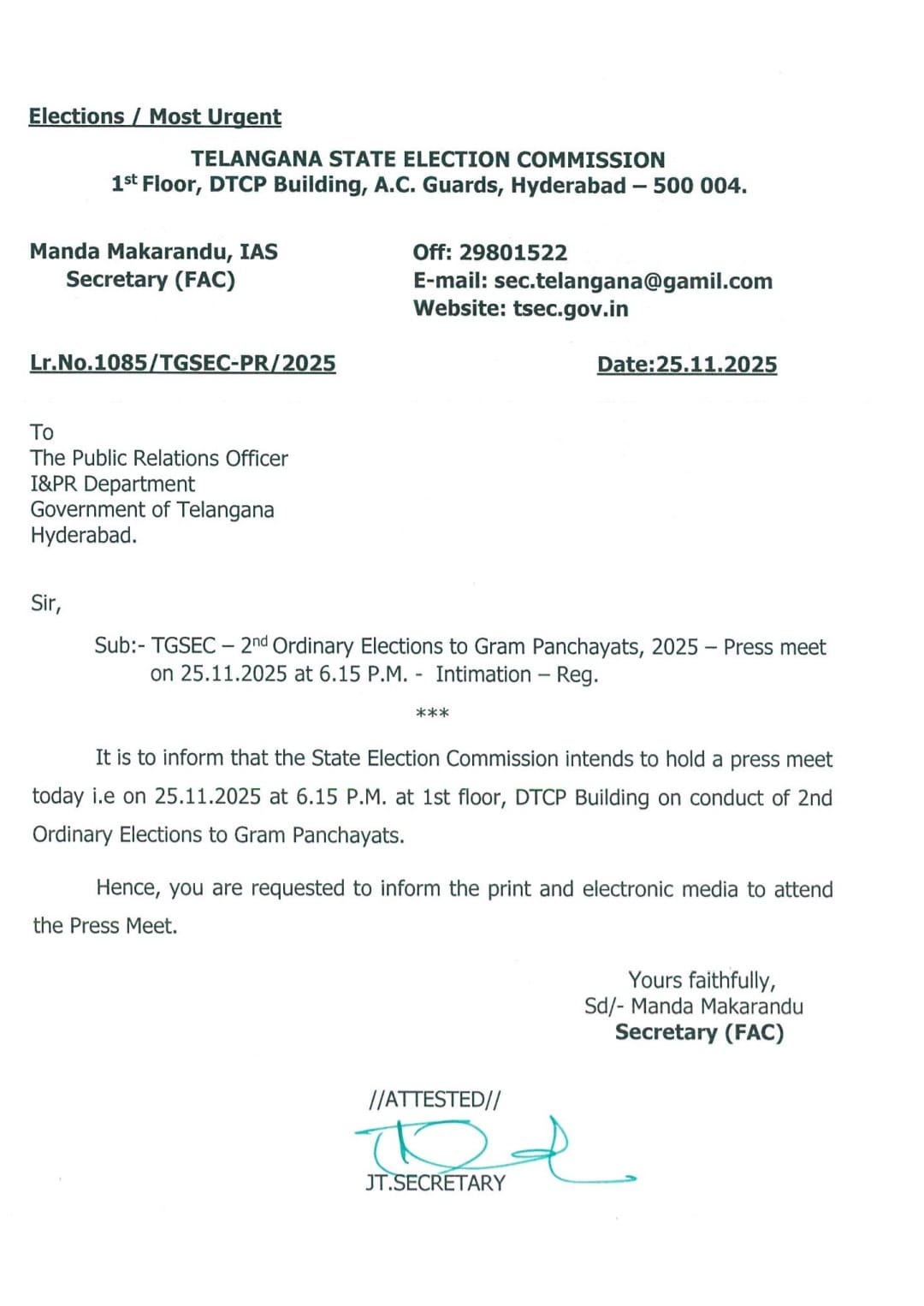 సాక్షి,హైదరాబాద్: తెలంగాణలో పంచాయతీ ఎన్నికలకు ముహూర్తం ఖరారైంది. ఎల్లుండే పంచాయతీ ఎన్నికలకు నోటిఫికేషన్ విడుదల కానుంది. ఈ మేరకు సాయంత్రం 6:15 గంటలకు ఎన్నికల సంఘం ప్రెస్మీట్ నిర్వహించనుంది. ఎన్నికల షెడ్యూల్ వివరాలను ప్రకటించనుంది. అయితే, ఎన్నికల సంఘం డిసెంబర్ 11న తొలివిడుత ఎన్నికల పోలింగ్ ఉదయం ఏడు గంటల నుంచి మద్యాహ్నం 2గంటల వరకు నిర్వహించనుంది. మద్యాహ్నం రెండు గంటల నుంచి ఎన్నికల కౌంటింగ్, ఫలితాలు విడుదల చేయనున్నట్లు తెలుస్తోంది.