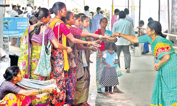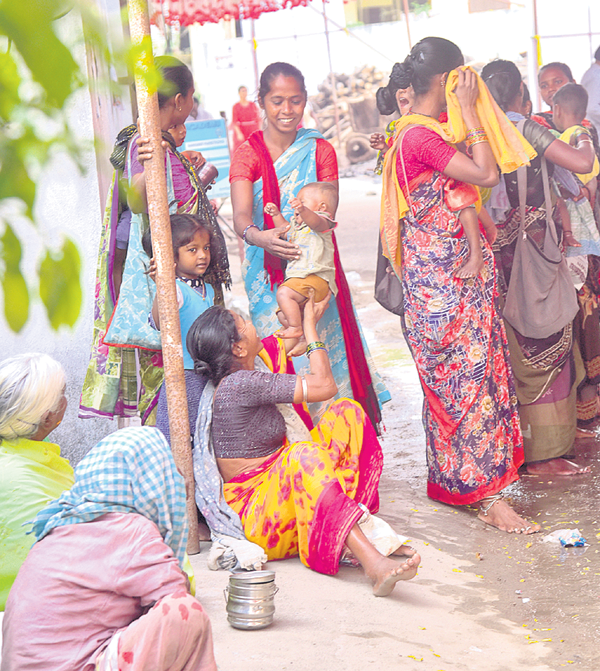 పండుగపూట తమ కడుపు నిండుతుందని గంపెడాశతో తమపిల్లలను చంకలో వేసుకొని గుడిముందు యాచిస్తూ కనిపించారు కొందరు మహిళలు. అంతలోనే ఒక్కసారిగా గురకపెట్టి ఆగకుండా ఏడుస్తున్న పాపని చూసి తోటి మహిళ తనకిమ్మంటూ ఎత్తుకొని తన లాలింపు మాటల పాటలు, ముద్దులు కురిపిస్తుంటే ఆ పసిపాప తల్లితో పాటు తోటి యాచకులు సైతం మొహంలో నవ్వులు చిందిస్తూ కనిపించారు.