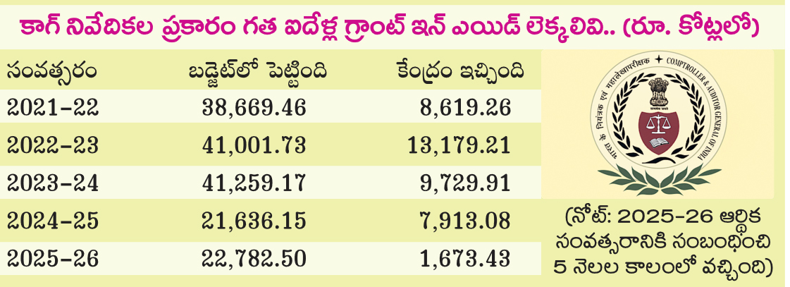 అప్పటి నుంచి ప్రస్తుత ఆర్థిక సంవత్సరం వరకు గ్రాంట్ ఇన్ ఎయిడ్ నిధుల విషయంలో భారీ అంతరం కొనసాగుతోంది. రాష్ట్ర ప్రభుత్వం ఆశించినదాంట్లో గరిష్టంగా 30 శాతం నిధులు కూడా ఈ పద్దు కింద రావడం లేదని కాగ్ గణాంకాలు చెబుతున్నాయి. ప్రస్తుత ఆర్థిక సంవత్సరంలో గ్రాంట్ ఇన్ ఎయిడ్ కింద రూ.22,782.50 కోట్లు వస్తాయని రాష్ట్ర ప్రభుత్వం అంచనా వేసి బడ్జెట్లో పెడితే.. తొలి ఐదు నెలల్లో (2025, ఆగస్టు 31 నాటికి) ఇచ్చింది రూ.1,673.43 కోట్లు మాత్రమే.