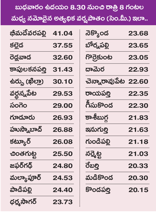 అత్యధికంగా హనుమకొండ జిల్లా భీమదేవరపల్లిలో 41.04 సెం.మీ.