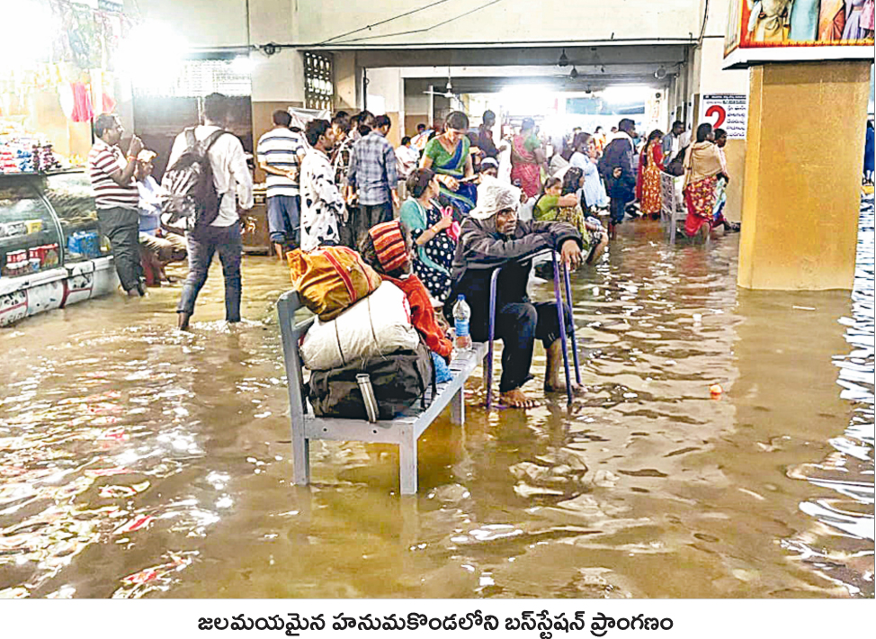 భారీ వర్షాలకు వరంగల్ నగరంలోని పలు కాలనీలు జలమయం అయ్యాయి. హనుమకొండ బస్టాండ్లోకి భారీగా వరద చేరి చెరువును తలపించింది. ఎస్ఆర్ నగర్, వివేకానందనగర్, సాయిగణేశ్కాలనీ, లక్ష్మీ గణపతి కాలనీ, మధురానగర్, గిరిప్రసాద్నగర్, గాం«దీనగర్, మైసయ్యనగర్, భద్రకాళినగర్, పోతననగర్, రాజీవ్నగర్, సమ్మయ్యనగర్, వాజ్పేయి కాలనీ, విద్యానగర్, పోచమ్మకుంట, ఇంద్రానగర్, దీన్దయాళ్నగర్, కాజీపేట ప్రశాంత్నగర్, బ్యాంక్ కాలనీల్లోకి వరద నీరు చేరింది. ప్రధాన నాలాలు పొంగిపొర్లాయి. హనుమకొండ, నయీంనగర్, కేయూ క్రాస్రోడ్డు, ములుగు క్రాస్రోడ్డు, హంటర్రోడ్డు, ఎన్జీవోస్ కాలనీ, అంబేడ్కర్ స్టేడియం తదితర ప్రాంతాల్లో వరదనీరు రోడ్లపైకి రావటంతో గంటలపాటు వాహనాలు ఎక్కడికక్కడే నిలిచిపోయాయి.
