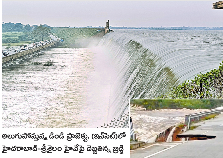 నల్లగొండ జిల్లాలోని డిండి ప్రాజెక్టుకు వరద భారీగా వచ్చి అలుగు ఉధృతంగా పారుతోంది. ప్రాజెక్టుకు కుడి భాగాన నాగర్కర్నూల్ జిల్లా ఉప్పునుంతల మండలం లత్తీపూర్ గ్రామ శివారులో ఉన్న రెండో అలుగు దిగువన హైదరాబాద్ – శ్రీశైలం రహదారి బ్రిడ్జి వరద ధాటికి దెబ్బతింది. దీంతో ఈ మార్గం గుండా వాహనాల రాకపోకలు నిలిచిపోయాయి. దీంతో హైదరాబాద్–శ్రీశైలం వైపు వెళ్లే వాహనాలను తెలకపల్లి– లింగాల– బల్మూర్– అచ్చంపేట మీదుగా దారి మళ్లించారు.