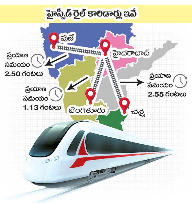 బెంగళూరు, చెన్నై, పుణె మూడు నగరాలతో అనుసంధానం కానున్న హైదరాబాద్ రైల్ కారిడార్లో.. తొలుత హైదరాబాద్–చెన్నై, హైదరాబాద్–బెంగళూరు కారిడార్లకు సమగ్ర ప్రాజెక్ట్ నివేదిక (డీపీఆర్) రూపొందించనున్నారు. వచ్చే ఏడాది మార్చి నాటికి ఈ రెండు కారిడార్ల డీపీఆర్లు పూర్తవుతాయని, ఆ తర్వాత 2027–28 ఆర్దిక సంవత్సరంలో హైదరాబాద్–పుణె కారిడార్ డీపీఆర్ ఉంటుందని సమాచారం. హైస్పీడ్ రైళ్లతో ప్రయాణ సమయం గణనీయంగా తగ్గుతుంది. ప్రస్తుతం హైదరాబాద్– బెంగళూరు, హైదరాబాద్–చెన్నై మార్గంలో ప్రయాణానికి 8– 10 గంటలు, హైదరాబాద్– పుణె మార్గంలో 10– 11 గంటల సమయం పడుతోంది. హైస్పీడ్ రైల్తో ప్రతి కారిడార్లో సుమారు ఏడు గంటల ప్రయాణ సమయం ఆదా కానుంది.