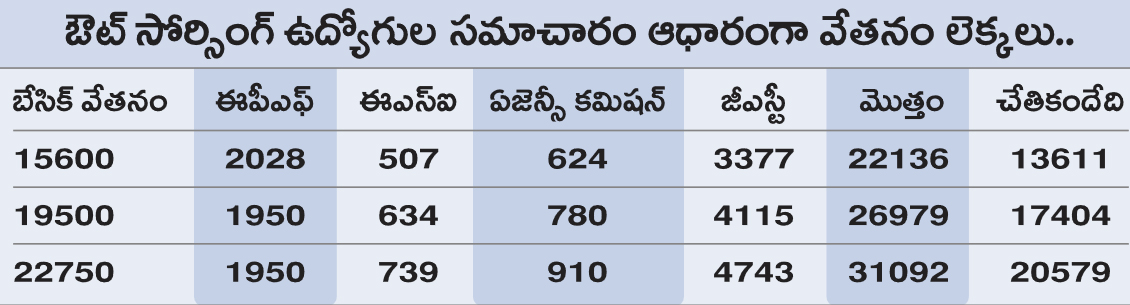 శాశ్వత ప్రాతిపదికన పనిచేసే ఉద్యోగులకు ప్రభుత్వం వివిధ కేటగిరీల్లో వేతనాలను ఖరారు చేస్తే... ఔట్సోర్సింగ్ పద్ధతిలో పనిచేస్తున్న వారికి మాత్రం మూడు రకాల స్కేళ్లలో వేతనాలు అందిస్తున్నారు. జిల్లాలు, మున్సిపల్ కార్పొరేషన్, రాష్ట్ర కార్యాలయాల్లో పనిచేసే వారిని మూడు కేటగిరీలుగా నిర్దేశించి వేతనాలు చెల్లిస్తున్నారు. ఉదాహరణకు ఒక ఔట్సోర్సింగ్ ఉద్యోగి బేసిక్ వేతనం రూ.15,600గా నిర్ణయిస్తే...ఈపీఎఫ్ రూ.2,028, ఈఎస్ఐ రూ.507, జీఎస్టీ రూ.3,377, ఏజెన్సీ కమీషన్ రూ.624గా పేర్కొంటున్నారు.