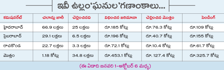 రోడ్డు మీద కాస్త ముందుకు వెళ్లి వాహనాన్ని ‘యూ టర్న్’తీసుకోవాలంటే నిర్లక్ష్యం.. రెడ్సిగ్నల్ పడినప్పుడు ఆగాలన్న విషయం పట్టదు.. సెల్ఫోన్ డ్రైవింగ్ చేయకూడదన్నా వినరు..రాంగ్సైడ్ డ్రైవింగ్, సిగ్నల్ జంపింగ్, వితౌట్ హెల్మెట్.. ఇవన్నీ ట్రాఫిక్ ఉల్లంఘనలు. రాజధానిలో మూడు కమిషనరేట్లలో ఈ ఉల్లంఘనులకు ట్రాఫిక్ విభాగం సరాసరిన రోజుకు విధిస్తున్న జరిమానా ఏకంగా రూ.1.62 కోట్లు. హైదరాబాద్, సైబరాబాద్, రాచకొండ పోలీసు కమిషనరేట్లకు సంబంధించి ఈ ఏడాది జనవరి–అక్టోబర్ 6 మధ్య గణాంకాలు ఈ విషయం స్పష్టం చేస్తున్నాయి. అయితే ఈ–చలాన్లలో 70 శాతం పెండింగ్లోనే ఉండటం గమనార్హం.
