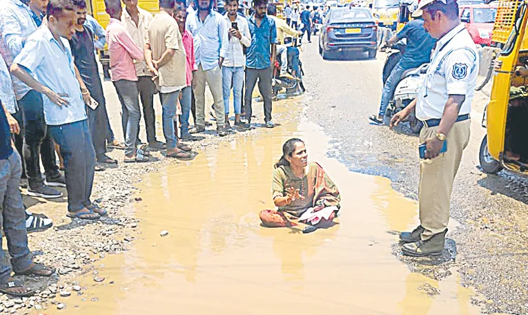 ఇదిలా ఉండగా గురువారం ఆమె స్యూటీపై నాగోలు వైపు వెళ్తుండగా బైక్ అదుపు తప్పి పిల్లలతో సహా కింద పడింది. స్వల్ప గాయాలు కావడంతో పిల్లలను ఇంటి వద్ద వదిలి ఘటనా స్థలానికి తిరిగి వచ్చి ఆమె రోడ్ల దుస్థితిపై ఏడాదిగా మేయర్, అధికారులకు విజ్ఞప్తి చేసినా పట్టించుకోలేదని ఆరోపిస్తూ బురదలో కూర్చుని నిరసన వ్యక్తం చేసింది.