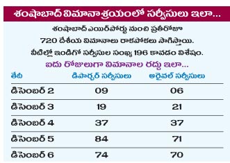 శంషాబాద్ విమానాశ్రయం మీదుగా ఇండిగో సగటున రోజుకు 196 సర్వీసులు నడుపుతుండగా అందులో మూడొంతులు రద్దయ్యాయి. ఆయా సర్వీసులను నడిపే పరిస్థితి లేదని ముందే తెలిసినప్పటికీ ఇండిగో సంస్థ ప్రయాణికులకు ముందస్తు సమాచారం ఇవ్వలేదు. దీంతో వారు తీవ్ర ఇబ్బందులకు గురయ్యారు. ప్రత్యామ్నాయ విమానం ఉందా? మళ్లీ సర్వీసును ఎప్పుడు ఏర్పాటు చేస్తారు.. అసలు సర్వీసు ఉంటుందా, టికెట్ డబ్బులు తిరిగిస్తారా.. లాంటి వివరాలు చెప్పేవారు కరువయ్యారు. ఇక వేరే ప్రాంతాల నుంచి హైదరాబాద్ మీదుగా ఇతర ప్రాంతాలకు వెళ్లే కనెక్టింగ్ ఫ్లైట్ ప్రయాణికుల ఆవేదన వర్ణనాతీతంగా ఉంది.