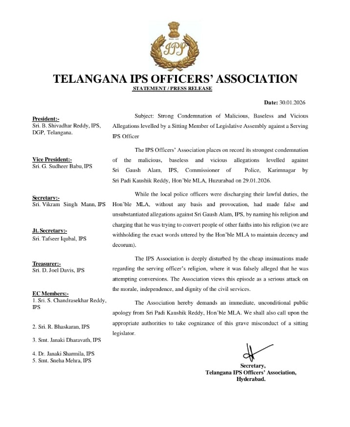 ఇటీవల ఎమ్మెల్యే పాడి కౌశిక్రెడ్డి కరీంనగర్ సీపీ గౌస్పై సంచలన ఆరోపణలు చేశారు. సీపీ గౌస్ మత మార్పిడులపై పాల్పడుతున్నారని అన్నారు. ఆ వ్యాఖ్యలపై ఐపీఎస్ అధికారుల సంఘం ఖండించింది. కౌషిక్రెడ్డి చేసిన వ్యాఖ్యలు నిరాధారం. కౌశిక్రెడ్డిపై చర్యలు తీసుకోవాలి’అని స్పష్టం చేసింది.